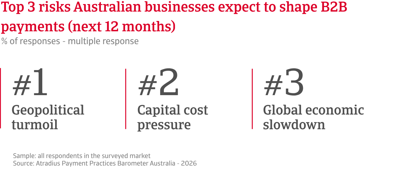 Companies surveyed in Australia report growing concern about volatile global markets as the current geopolitical turmoil is disrupting trade flows significantly. Uncertainty about how the situation will evolve is adding further pressure on supply chains. Operating costs are expected to remain high, while transport reliability is likely to deteriorate further in the months ahead. Businesses anticipate that disruption along key trade routes will continue to lengthen delivery times and strain supply chains. These developments are likely to feed directly into operating expenses and influence how businesses prioritise payments. Many companies anticipate a clear shift in B2B payment behaviour during the coming months as customers assess their own liquidity and adjust payment schedules accordingly.