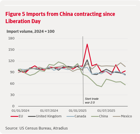 At the bilateral level, trade data more clearly reflect the impacts of the tariff regime. Imports from China have continued to contract sharply since Liberation Day, accelerating the decoupling that began under the first Trump administration . In contrast, imports from most other major partners have been more volatile but far less compressed. Mexico stands out with imports now around 5% higher than in 2024, reflecting USMCA exemptions and its role as a key alternative production base (figure 5).