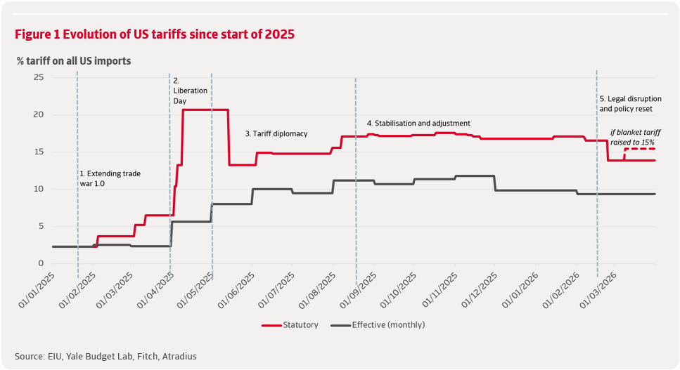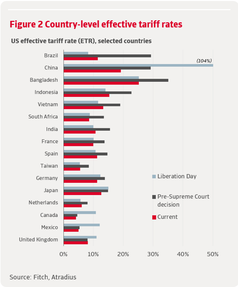 A Supreme Court ruling in the end of February 2026 invalidated most emergency-based tariffs – amounting to about 75% of all US tariffs. The administration responded by introducing a temporary universal tariff under Section 122 of the 1974 Trade Act, replacing the previous country-specific tariff regime with a uniform import surcharge. While the structure has become simpler, the statutory tariff rate remains at 13.9%, six times higher than before the escalation began. Fitch estimates that this brought the effective tariff rate down only slightly to 9.4%.
