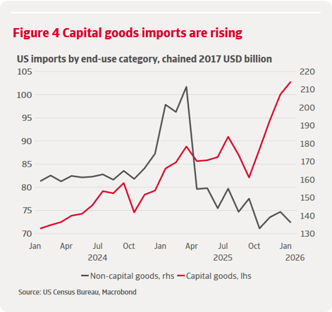 The persistence of US domestic demand has limited the impact of higher trade barriers on aggregate import volumes. This is especially visible when we look at the composition of imports. The AI-driven investment boom has sustained strong demand for imports of high-tech goods associated with AI and data centres despite higher prices. Capital goods imports – including computers, semiconductors and accessories – have been rising strongly through the year. In January 2026, capital goods imports were 16% higher than the 2025 average while non-capital goods imports were trending downward after a front-loading surge ahead of Liberation Day (figure 4).