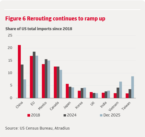 The dominant adjustment has been trade diversion rather than import substitution. This is in line with expectations given the stickiness of global value chains. Recreating domestic supplier networks is a major investment that requires significant, persistent shocks, making diversion of trade the path of least resistance in the short to medium term . As firms responded to the layered tariff structure, supply chains were rerouted to minimise exposure while maintaining overseas sourcing. Other Asian economies and Mexico gained US market share as Chinese exports were displaced or channelled through third countries (figure 6).