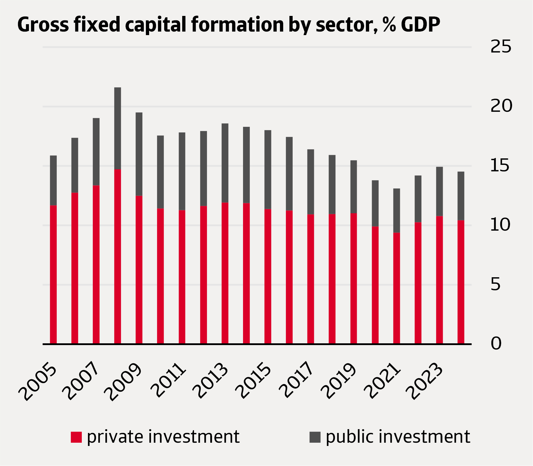 Capital investment in South Africa has been low for years. In 2024, investments were only 14.5% of GDP, insufficient to accelerate the growth needed.