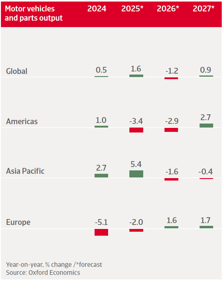 - Global: We expect global motor vehicles and parts production to grow by 1.6% in 2025, followed by a 1.2% contraction in 2026. This decrease is partly due to the US tariffs